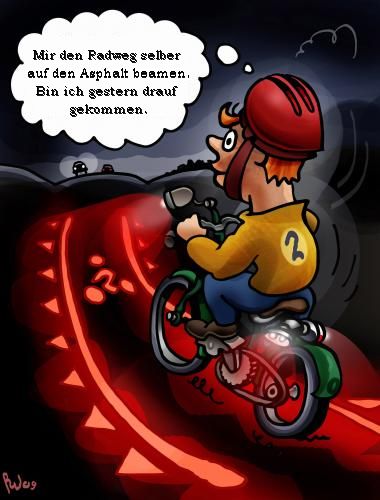 Wenn der Radweg fehlt / Vegan WitzeMeine Grossmutter wollte fitter werden, so hatte ich Ihr ein Fahrrad geschenkt. Sie begann mit 30 km am Tag. Unser Problem: Sie wurde nun 85 und niemand weiss. wo sie ist. Gestern auf der Strasse fuhr mich ein Radler um. Er half mir wieder auf die Beine und flüsterte mir ins Ohr: Da haben Sie aber verdammt Glück gehabt. Ich schrie: Was soll daran Glück sein? Er antwortete cool: Normalerweise fahre ich einen Vierzigtonner! Mein Hund hört nicht auf, Leute auf dem Fahrrad zu verfolgen. klagte mein Freund. Das ist schlimm, sagte ich mifühelnd, Denkst Du daran, den Hund abzugeben? Tierheim?" Sagt er: Nein, viel einfacher: Ich versperre sein Fahrrad. Herr Doktor, ich schlafwandele jede Nacht, tags bin ich wie zerschlagen. Was soll ich tun? Sagt der Doktor: Nehmen Sie ein Fahrrad mit ins Bett. Der Polizist, nachts: Ich muss Sie verwarnen, Hochwürden, an Ihrem Fahrrad fehlt das Rücklicht. Der Pfarrer entgegnet: Ein Rücklicht habe ich nicht nötig, der Herr ist allzeit mit mir. Der Polizist wird streng: Das wird teuer: Zu zweit auf einem normalen Fahrrad! |
